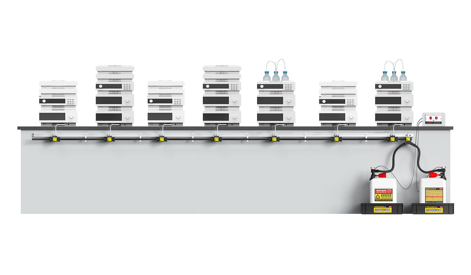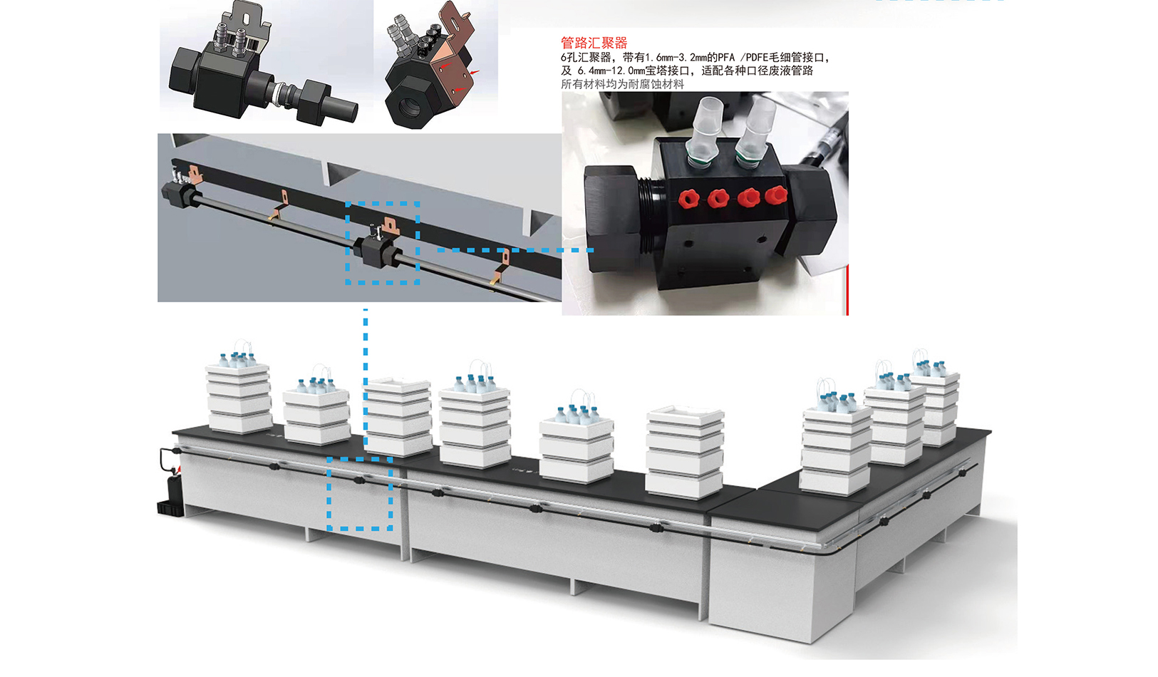 (1)每排多臺液相色譜儀廢液接口,主管道采用Ф20mm,每臺有6孔匯聚器,帶有1.6mm-3.2mm的PFA /PDFE毛細(xì)管接口,及 6.4mm-12.0mm寶塔接口,適配各種口徑廢液管路,完全密封無揮發(fā)。